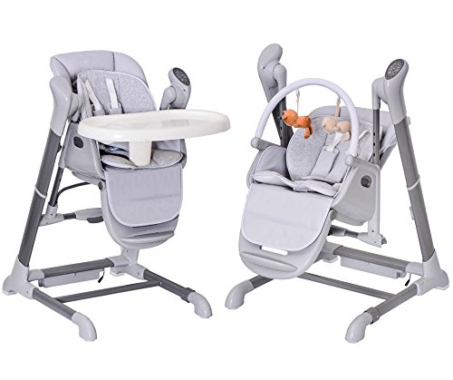 Avec cette chaise bébé, votre enfant bénéficiera d’un confort exceptionnel en mangeant ou en jouant. Elle est convenable pour les nouveau-nés et peut servir jusqu’à 3 ans. Ses 3 modes (balancelle, chaise haute et transat) offrent plus d’options à l’enfant. Le mode balancelle est destiné aux nouveau-nés jusqu’à leur neuvième mois. Quant au mode chaise haute, il est destiné aux enfants de 6 à 9 mois. Le mode transat est utilisable dès la naissance jusqu’à 9 mois. Très pratique, le meuble dispose d’un panneau de contrôle composé de 8 vitesses de balancement, de 12 mélodies + 2 sons de nature et d’un détecteur de pleurs de bébé. Pesant environ 12 kg, elle présente des dimensions se résumant à 55 x 80 cm.
