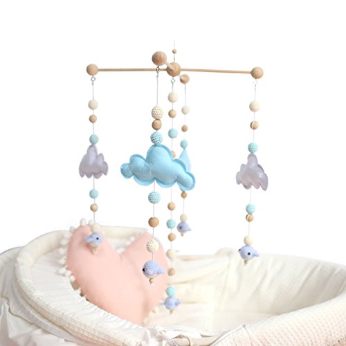 Une version plus délicate et douce avec ce joli mobile bébé en bois de la marque Baby tete. Ce modèle arbore de belles couleurs pastels qui s’harmonisent très bien avec sa structure en bois. Les petits perles sont ornées de laine et les nuages en feutrine sont très agréables à regarder virevolter.